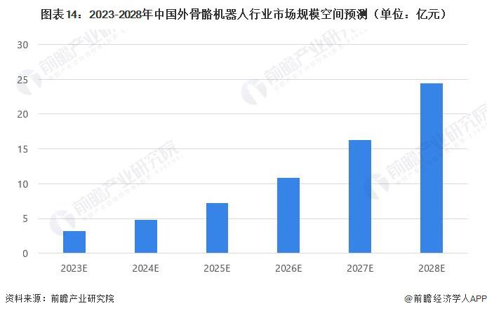 国家政策的支持,为外骨骼机器人行业,特别是医疗康复外骨骼机器人产业发展提供了良好的环境;与此同时,国内外骨骼行业初创企业不断将新获得的融资投入技术研发,解决产品在人机交互等方面的问题,促进了行业产品的升级。未来,随着外骨骼机器人行业产品性能的提升和成本的下降,下游不断增长的需求将会刺激行业市场规模的不断增长;医疗康复领域外骨骼机器人产品的技术进步将会带动工业用外骨骼机器人及助力助行外骨骼机器人的产品迭代,外骨骼机器人的应用市场将会进一步拓展。预计未来中国外骨骼机器人行业市场规模仍将快速增长,预计到2028年,中国外骨骼机器人市场规模将达到24亿元,2023-2028 年年均复合增长率(CAGR)约为50%。
