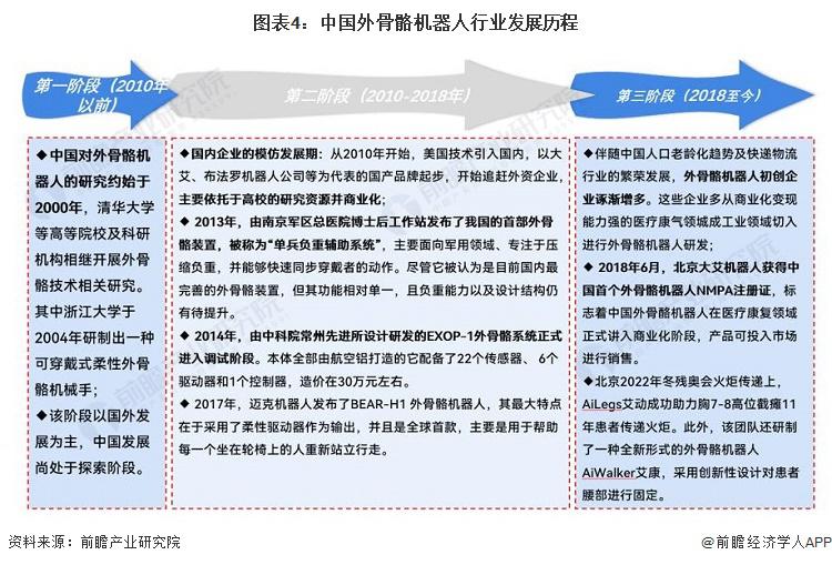 外骨骼机器人从国外起步,首先应用于军事领域。中国对外骨骼机器人的研究约始于2000年,2010年中国进入外骨骼机器人的模仿和发展期。随着机器人技术的飞速发展以及机器人行业市场规模的不断扩大,企业与高校合作研究外骨骼机器人的模式逐渐增加,外骨骼机器人行业从研发阶段逐步迈入商业化阶段。