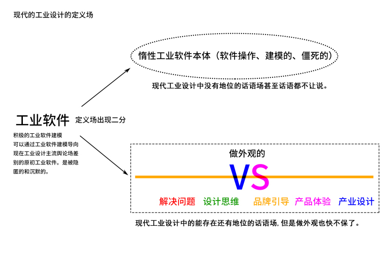 但是也出现了一个问题,工业软件的普及必然导致设计门槛的降低,更多的设计师开始涌入工业设计行业,当然会出现设计师整体水平的下降,就如同大工业诞生初期工业化批量生产的产品属于粗制滥造、丑陋一样。历史仿佛又回到了,二战之前的历史中。现代时期工业设计的矛盾更多是做外观和解决问题的矛盾(或者说通过做外观同解决问题拉开距离),但是新的例外或者新的之前不被容纳甚至污蔑的东西肯定会重新出现,但到底是什么,就如同在二战之前1850-1933,批量生产量产等概念不被容纳,现代这个时代下那个不被承认,被污蔑的例外是什么。“做外观”虽然地位低但好歹还有存在论的地位。解决问题不用说地位很高。通过寻找其实发现,工业软件作为例外是现在工业设计界共同所不能容纳的东西,甚至是丑闻。因为就是工业软件带来了工业设计界整体设计水平的下降,设计的产品变得庸俗化。我这里说的工业软件是工业软件概念,就是说“工业软件”会出现一个存在方式上的二分,第一种会分裂成一个代表惰性(消极)的软件实体就是我们现在经常说的被动的软件操作部分,另外一部分分裂成就是我们现在所看到的关于做外观和解决问题相关差别的描述,包括设计思维,产业设计等相关话语,就是说我们今天听到的关于做外观,解决问题等言语都是原初工业软件作为生产力(工具)所生成出来的话语概念体系,但是这个二分后的概念体系会反过来污蔑和不承认这个工业软件。就是说现在做外观还有解决问题、设计思维、产业设计等语言符号体系其实都只是这个“工业软件”的一部分。(可能会比较晦涩,后面会有配图)工业设计师不是一直在用工业软件建模渲染来设计产品,他是构成现代工业设计的一个重要内容但现在却不给他存在论地位,甚至污蔑说软件是操作,你不就是画图的吗。这种情景就和上个世纪,污蔑工业化批量生产是粗制滥造行为一样复古。