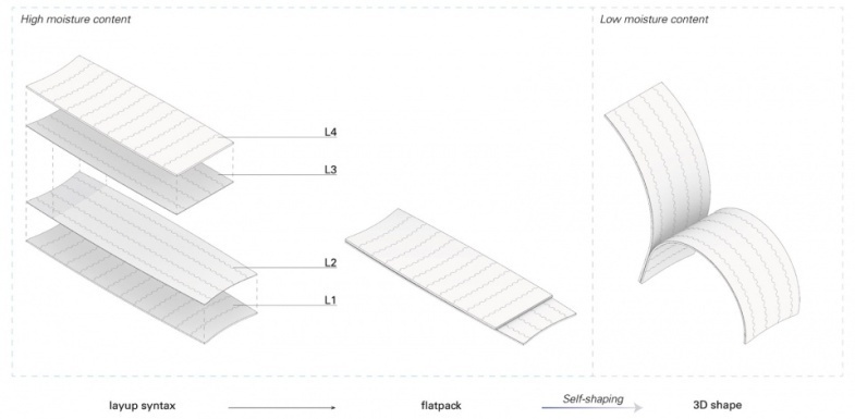 ▼HygroShape自动展开示意图, HygroShape self-shaping diagram ©ICD University of Stuttgart