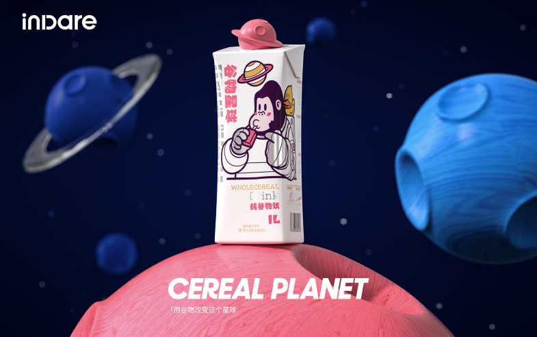 潮饮赛道上,与「Cereal Planet 谷物星球」合作进行品牌升级, inDare 在原先包装设计的基础上,结合谷大猩的 IP 形象,以动画及效果图渲染的形式深度还原谷物奶的制作过程,打破外界对传统饮料的固有印象,以更有趣、更生动的方式将创意设计呈现出来。