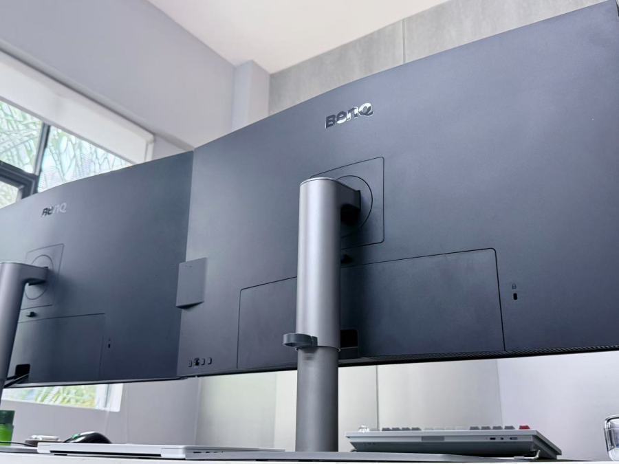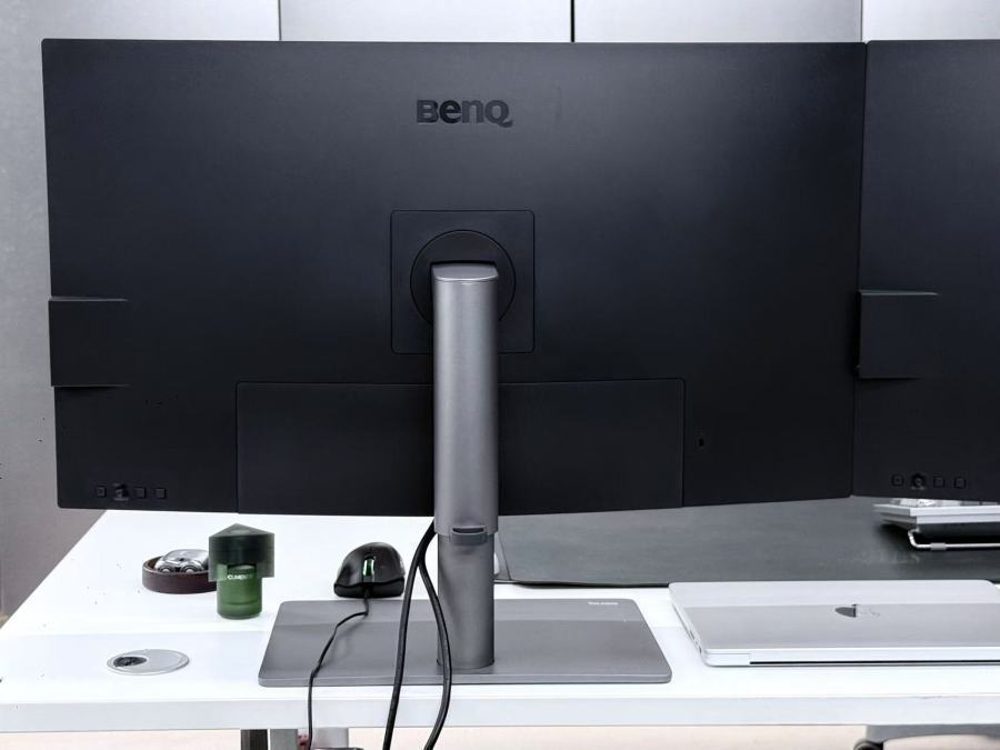 整体外观上,矩形的合金底盘和圆管支架,支撑起整个屏幕,没有任何多余的设计。这绝对是一款无法在再做任何减法的设计,作为产品设计师非常清楚,这种极简对于材质和工艺提出了极其苛刻的要求和挑战。如果质感稍微有一丁点疏忽,极简就会变成简陋。在BenQ DesignVue-高端机身上,你完全挑不出任何瑕疵,后壳黑色哑面质感,几乎看不到分模线,超高的模具精度,充分体现了明基在产品制造工艺上的高水准与严谨态度。