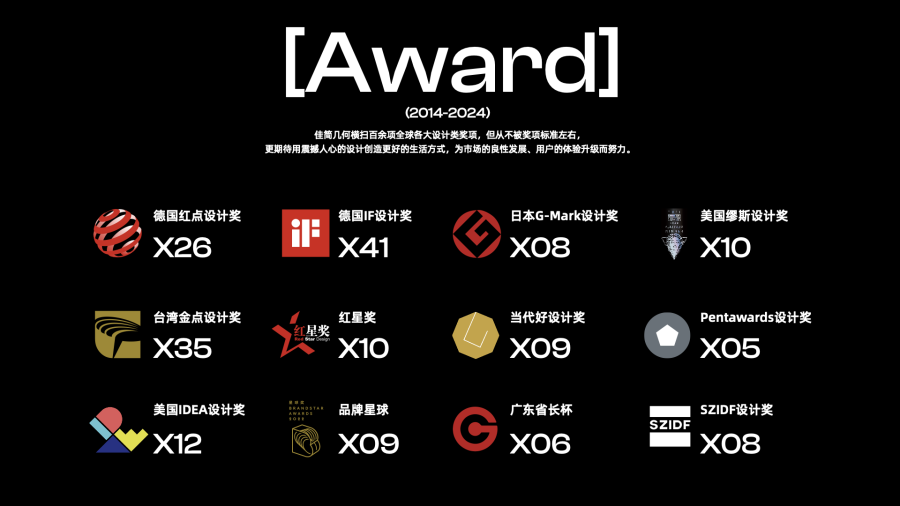 经过十余年的拼搏与沉淀,佳简几何已经拥有了一支由两百位专业设计师组成的精英团队,他们具备多元化的设计背景与创新思维,能够为不同领域的客户提供精准且富有创意的设计解决方案。公司在深圳设立总部,并在珠三角和长三角分别建立了设计中心 ,整合了两地的人才、技术与供应链优势,实现了对市场的快速响应与高效服务。凭借卓越的设计实力与出色的项目成果,佳简几何被评为国家高新技术企业、省级工业设计中心、市级工业设计领军企业 ,七次获评深圳市十佳工业设计公司并蝉联五年榜首,荣获包含世界四大设计奖项(Reddot、iF、IDEA、G-Mark)在内的 260 余项国内外设计大奖 。