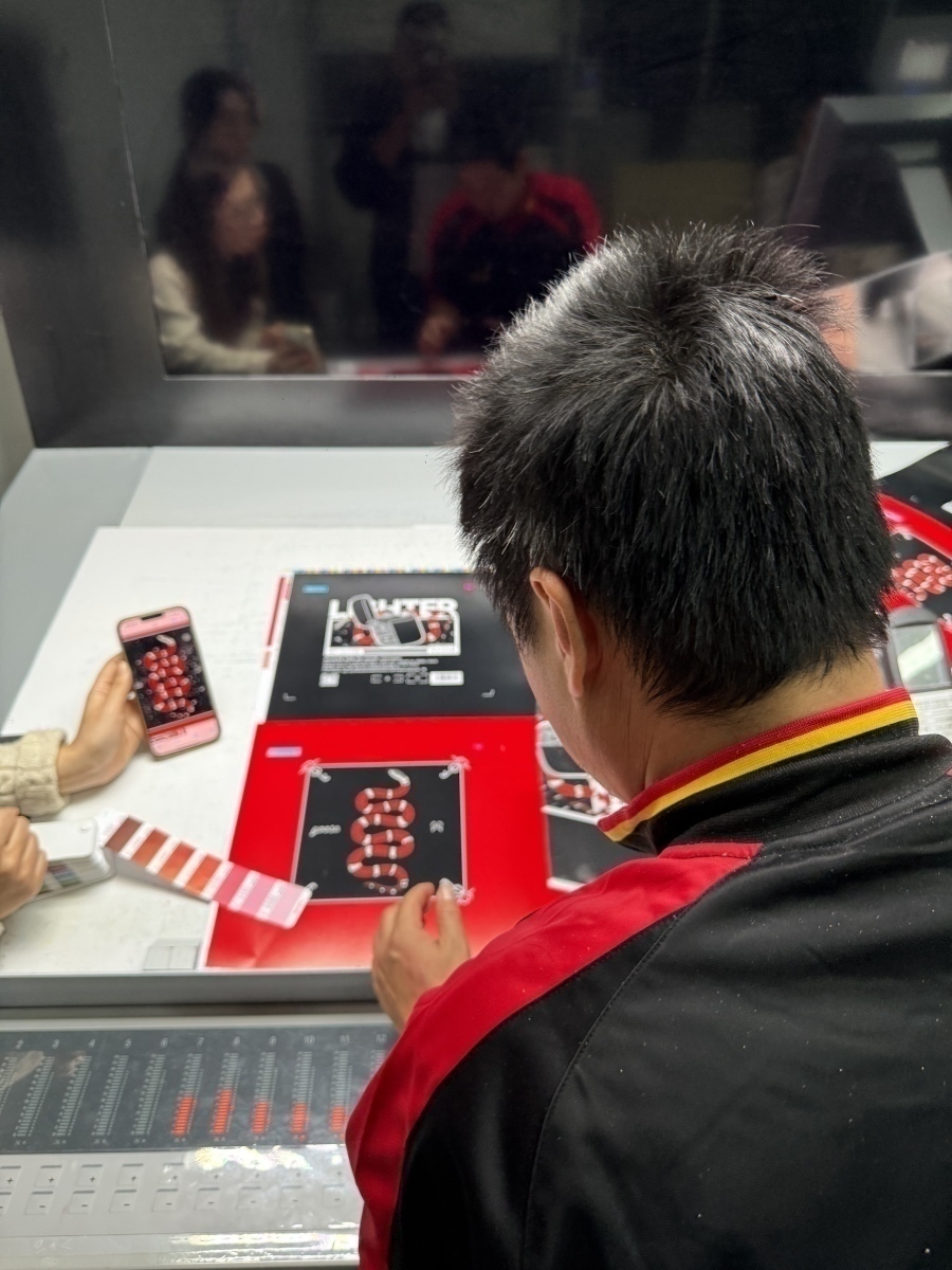 因为是现场校色,所以统一参考标准非常必要。设计师会以IPHONE 50%的亮度模式来展示最终的配色,让工厂的调色师现场调色。