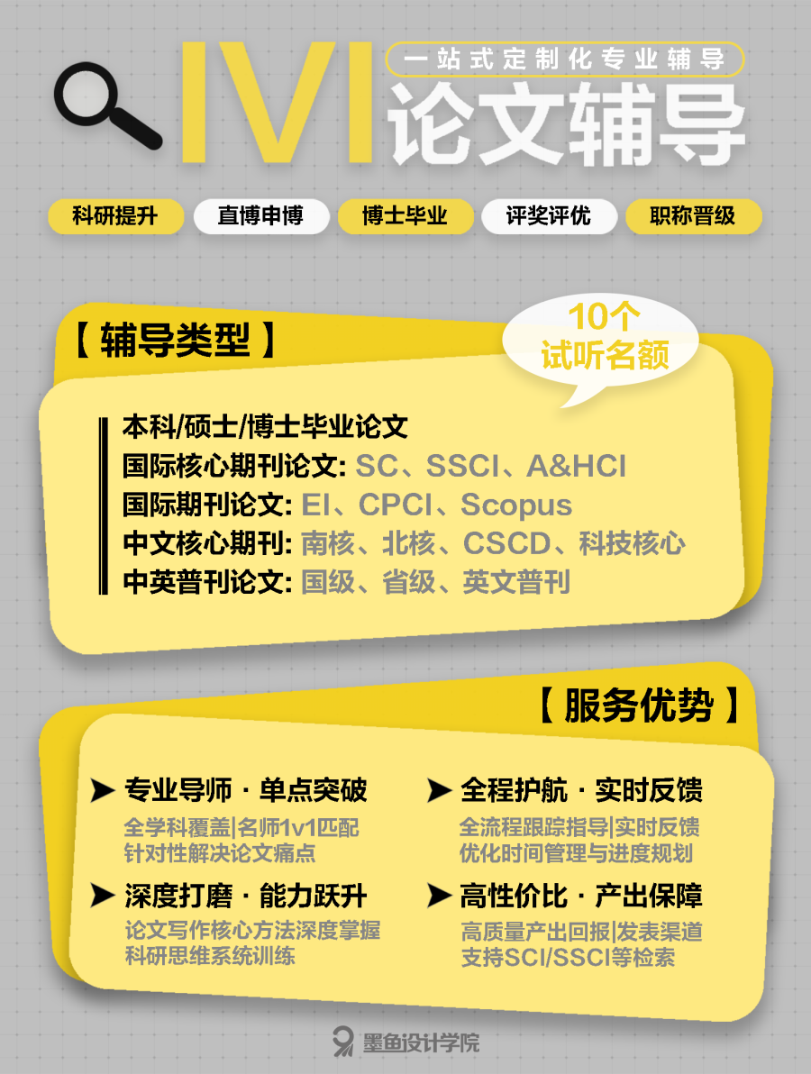 墨鱼设计学院(公众号:MO 墨鱼设计)的价值远不止于论文成果辅导产出。课程重心在于通过系统性科研训练,实现学生学术能力的跃迁:掌握论文写作的核心方法、建立严谨的科研思维逻辑、提升独立解决问题的创新能力。这些能力成为学生升学、毕业、评奖评优乃至未来职称晋级的核心竞争力。学员最终获得的不只是几篇可发表的高水平论文,而且是未来学生深耕和职业发展的进阶之路。