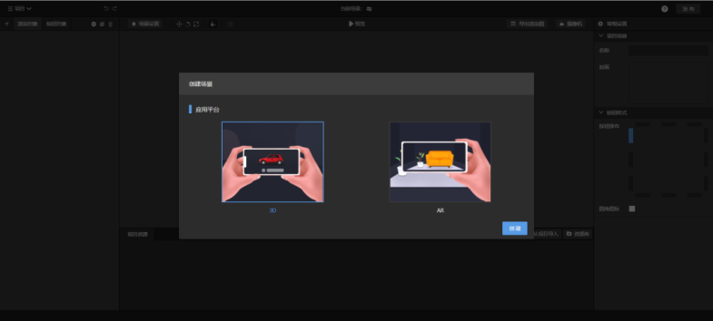 2.命名场景后进入编辑器页面,选择应用到3D或AR平台,点击创建;