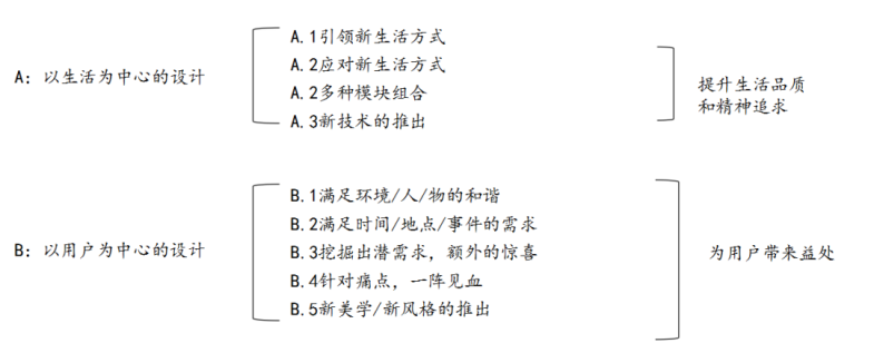 A类:以生活为中心的设计,用户小量存在,定量调研,根据预判和第一代产品,逐渐影响革新者生活,逐渐会形成潮流。