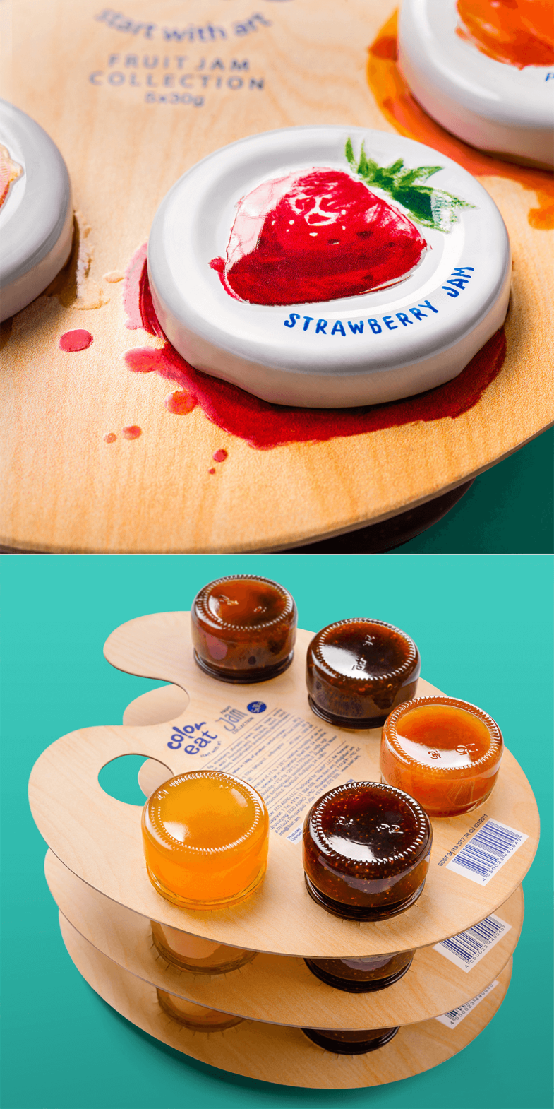 设计机构创新性地将早餐果酱与画家手中的调色板结合,每个“调色板”包装都可放置5种不同口味(草莓,无花果,南瓜,桃子和斐济果)的果酱,糖分摄入刚好符合推荐摄入量。这些美味的果酱就像彩色的颜料,孩子们可以使用勺子作为画笔,在画布一般的吐司上发挥想象,随意挥洒。吃早餐的同时也激发了孩子的想象力与创造力。