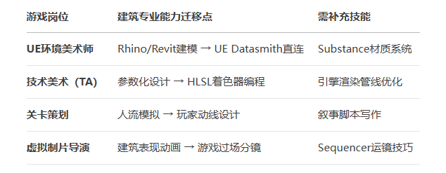 建筑生熟练使用 Rhino、Revit、UE5 等工具,与游戏开发管线无缝衔接;丰富的历史建筑研究经验,可直接转化为游戏世界观设定,省去大量调研成本。
