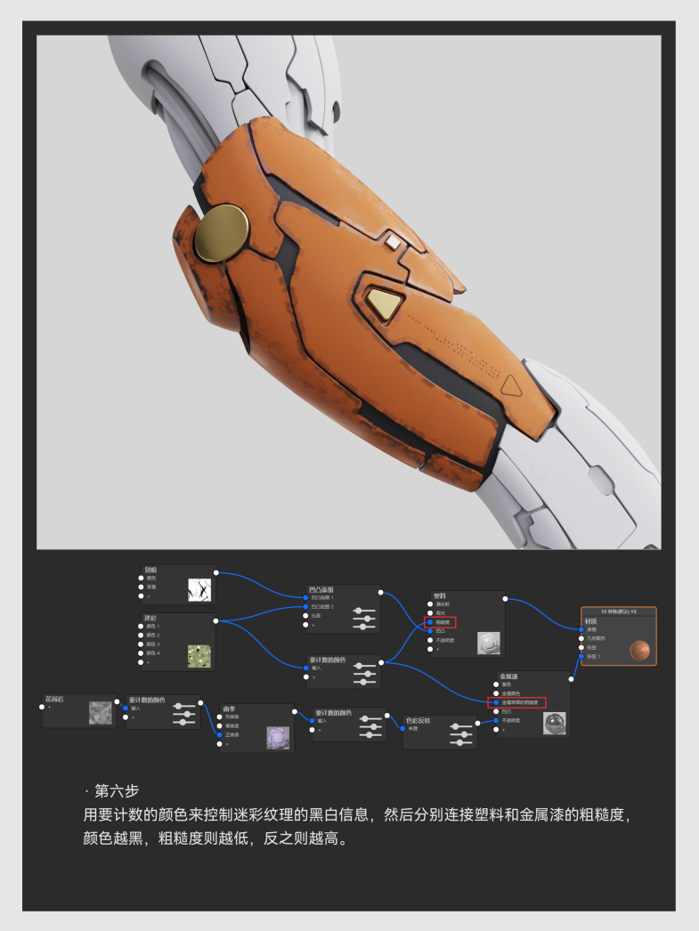 用要计数的颜色来控制迷彩纹理的黑白信息,然后分别连接塑料和金属漆的粗糙度,颜色越黑,粗糙度则越低,反之则越高。