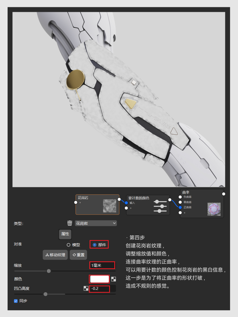创建花岗岩纹理,调整缩放值和颜色,连接曲率纹理的正曲率,可以用要计数的颜色控制花岗岩的黑白信息,这一步是为了将正曲率的形状打破,造成不规则的感觉。