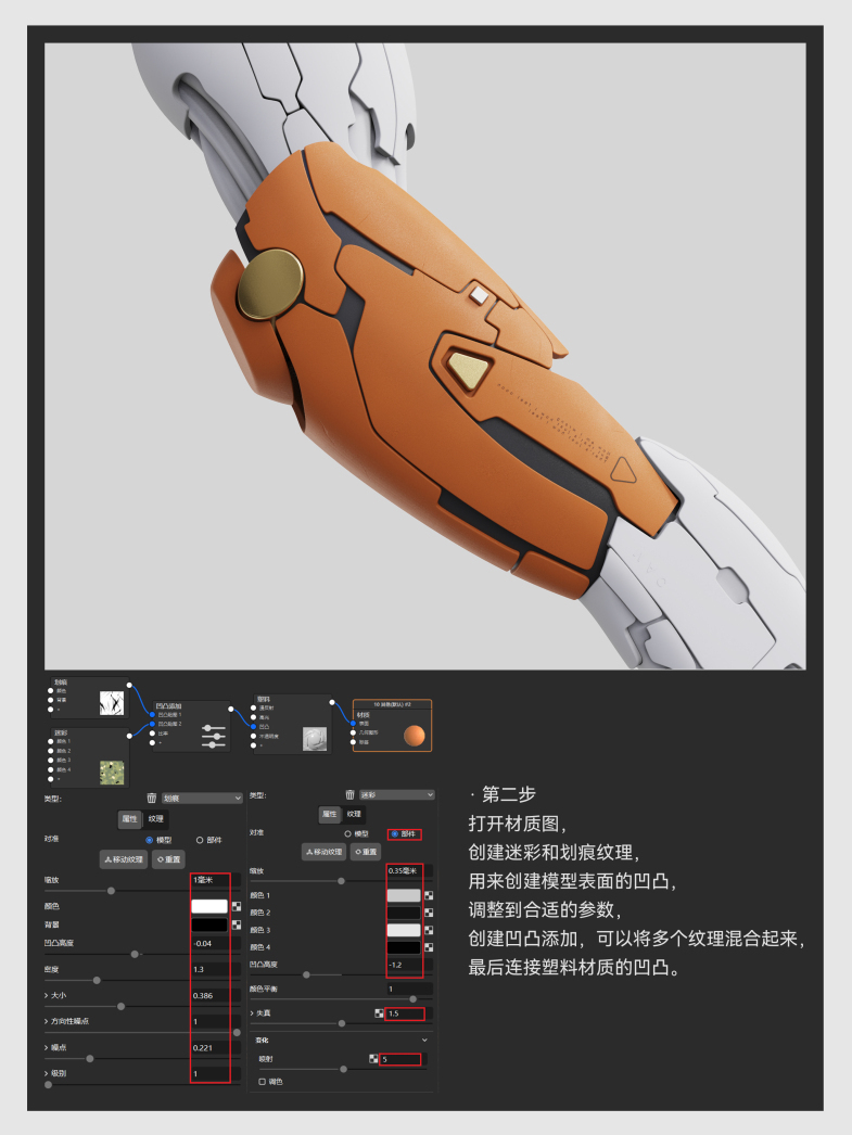 打开材质图,创建迷彩和划痕纹理,用来创建模型表面的凹凸,调整到合适的参数,创建凹凸添加,可以将多个纹理混合起来,最后连接塑料材质的凹凸。