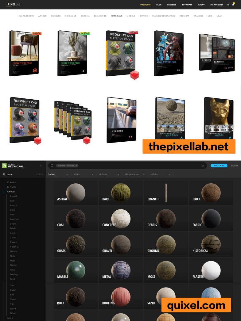 pixellab里有针对不同渲染器的材质包,除上面提到的8个PBR贴图网站,大家也可以下载如灰猩猩的材质球也是不同渲染器都可以通用的。