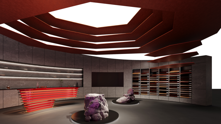 唯美展厅的设计围绕设计与探索展开,“X”代表未知和更多可能性,空间以层层递进的多彩空间展现想象力的无限延伸。空间内的石材装置呼应着品牌岩板产品的材质渊源,两处截然不同的空间体验创造出更多可能性,邀约来访者共赴一场美好的创意盛宴。