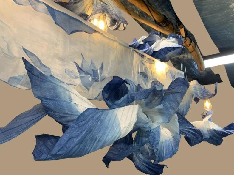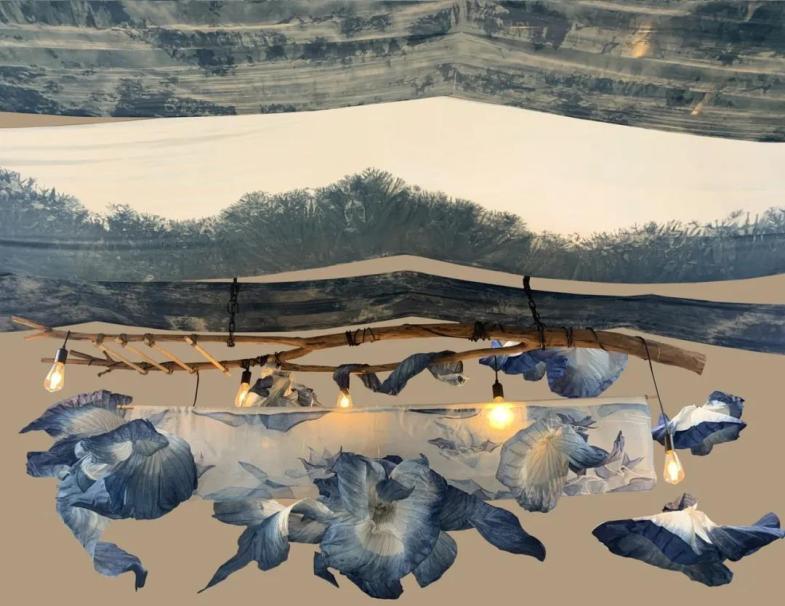 实践以作品以《浮》为主题,是围绕草木染工艺进行的手工艺创作。作品以传统艺术中的荷花、荷叶元素为装饰语言,结合其轻盈飘摇的形态来塑造一种轻盈感与空灵感,形成一种外在优美柔和的抽象形态表达,结合蓝染宁静深远的色彩感受,凸显中国文化韵味,阐述一定的东方自然哲学,抒发对传统工艺及传统语言的情感表达。