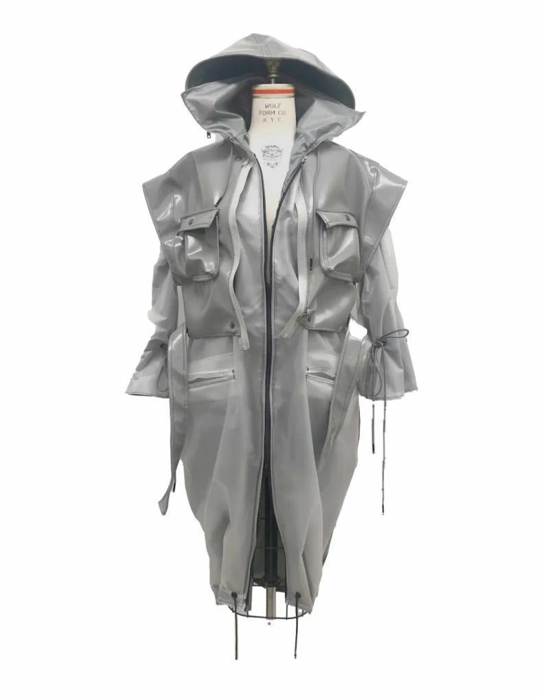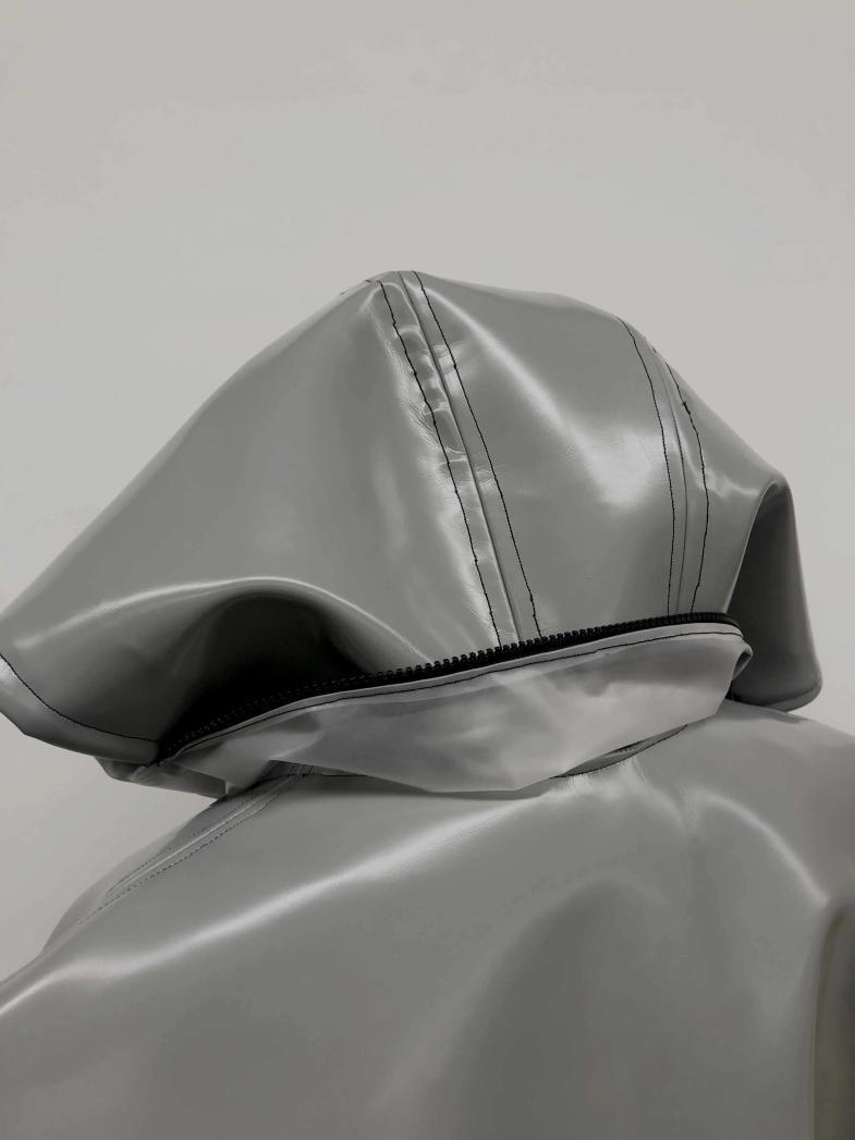 这是一件结合多功能和时尚的雨衣。材料方面使用了近似真皮的Pu,在保护环境和可持续发展的概念下也可达到其想要的效果。其次,使用了柔润度极高的pvc环保塑胶来塑造雨衣的功能化。在细节方面,用了抽绳来加紧在袖子和大衣尾部的收缩感提高客户个性化和设计美观度。