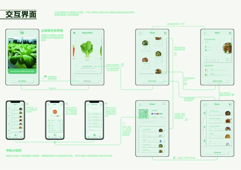 绿色列车是列车上的新鲜蔬菜种植供应系统,迎合了长途旅行的乘客与长期在列车上工作的列车员对于新鲜蔬菜的需求。列车员利用附属培育箱预先种植幼苗,待到成熟替换到主箱进行展示出售;以交互系统辅助列车员培育与帮助乘客选择与点单,从而形成绿色新鲜蔬菜产销供应链,为铁路系统带来健康福祉的同时带来新的商机。
