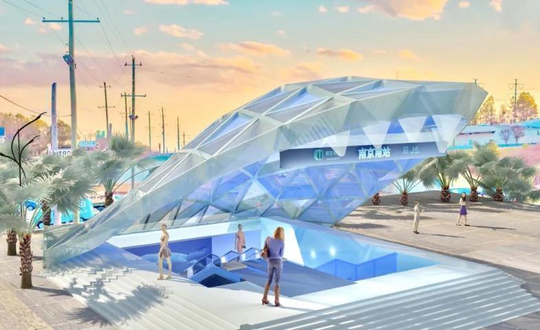 这个设计结构上是用钢铁结构搭建一个类似于等边三角形的稳定结构,再等分成90个三角形,在钢架结构下各一层不同颜色的玻璃。在顶部安装了六颗牙齿状的灯,整个地铁口的设计呈现淡蓝色,地面、扶梯、墙面也是偏蓝色系。结构上是用钢铁结构搭建一个类似于等边三角形的稳定结构,再用等分成90个三角形,在钢架结构下各一层玻璃。材质上是在上面一层用较透明的蓝色玻璃,下面一层用偏深色的,阳光打下或者夜晚开灯时候可以透出整体的蓝色。