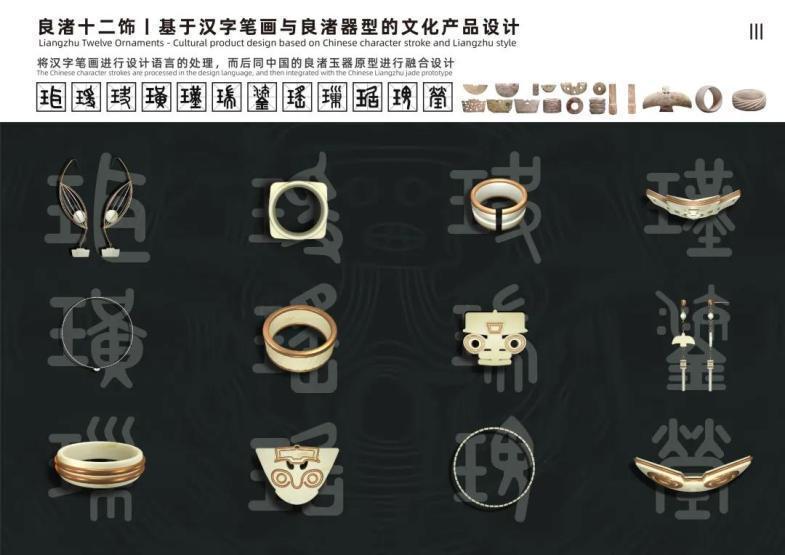 设计方案主要是通过提炼总结良渚玉器器型的文化语言,以良渚玉器为设计原型,融合汉字的笔画部首,输出具有中国风格的文化产品,促使传统文化与现代社会生活进行深度融合,以向世界展示中国文化、中国产品,增强文化自信。