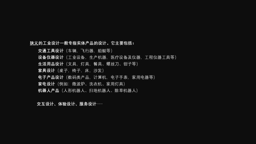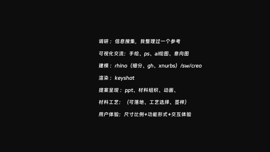 这里有个简单的分类,不同的产品赛道,不同赛道产品在材料、工艺、标准、方法上还是有不同的,比如交通工具对手绘要求更高,可能涉及油泥;家具更多布料、五金、木材;机器人可能设计到避开传动结构活动空间去做设计。