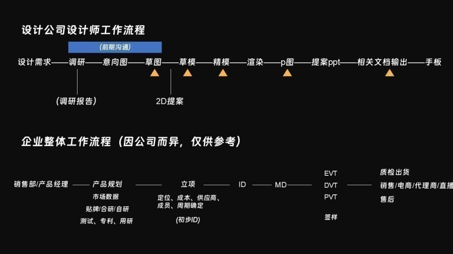 设计公司工业设计流程,和企业工业设计流程,企业设计流程中工业设计师所做的内容其实和设计公司也差不多,只是放到了一个更长的流程链条当中。
