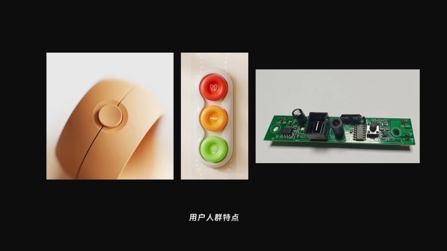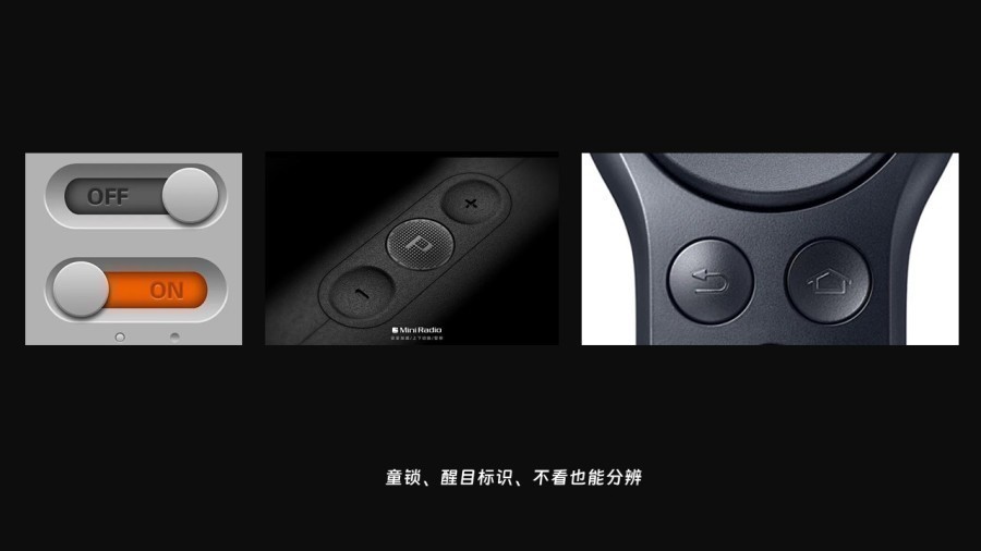 在中间的设计作品中,有3个按键,给中间的按键做上纹理,如果用户不会拿反产品,那用户其实可以根据这个纹理位置判断上下按键是什么功能;还有更简单的方法是把两个按键一个做凹,一个做凸,那我闭着眼睛也可以区分它们。