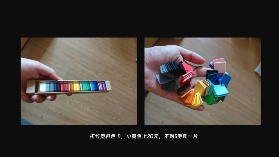 在我过去的设计工作当中,有份工作工作繁忙,工厂离公司较远,公司很少外派设计师跟进调色,为了得到一个更好的塑料件颜色,我也经常会采用寄样的方式。 毕竟色卡是在纸张上印刷,塑料是色母粒,媒介不一样,如果我能找到一个接近效果图的塑料,寄给工厂去调塑料颜色就会好很多,还有个别工厂潘通色卡都没有。有一段时间,我甚至会去文具店去找颜色接近的塑料制品,后来我发现有一个东西很好用,就是拓竹打印机送的塑料色卡,某二手交易平台 20块一串,每片不到5毛钱,如果是从CMF机构购买专业塑料色卡一片要几百块,用拓竹这个丢了也不会心痛。