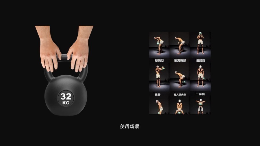 为一个壶铃产品,右边是它的使用动作,我们虽然说工业设计工作是做外观,但也要考虑到多方面的因素,比如他有双手持握的动作,那么我上面的把手就不能太短,用户有下甩的动作 所以说壶铃不能太锋利,也可以考虑做柔软材质。