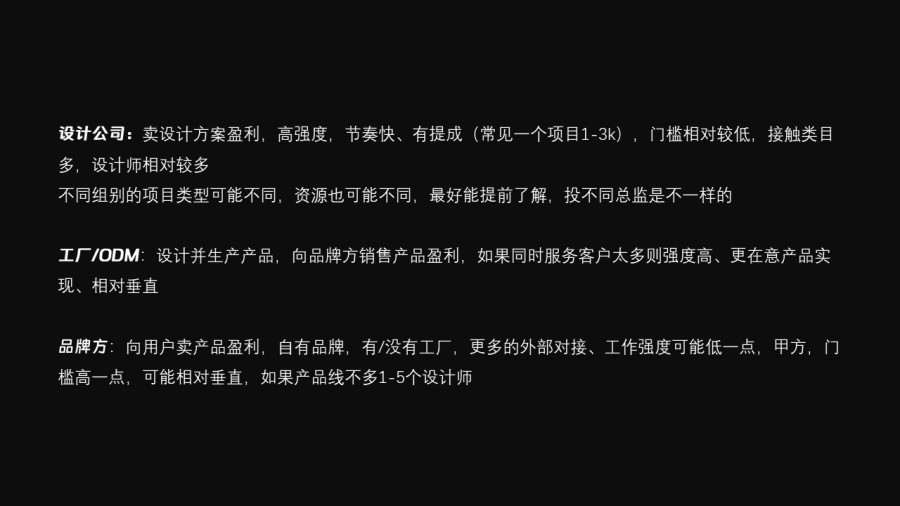 一个很重要的点,我感觉设计公司多少有点散装,就是他不同总监之间资源差异可能会很大,项目类型、工作强度、工作氛围都有差异,可能多个总监都在同一个招聘软件招人,最好能提前打听一下。