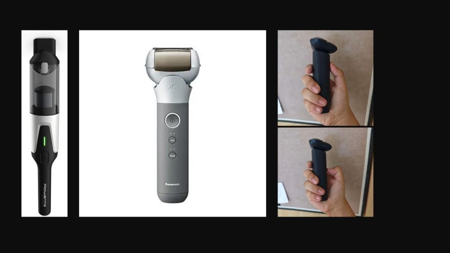 左边两张图都为手持产品,按键位于手柄上方,主要考虑到人拇指的操作的灵活性,看图的时候,我注意到中间的产品,它上面的按键最大,下面两个按键要小,除了区分主次 让电源按键更醒目这一原因以外,我也在积极思考其他原因,我拿着自己的剃须刀做了一下模拟,拇指下移的过程中手指和产品表面的接触面积在变小,我觉得这也是顶部按键做大,下方按键做小的一个人机工学依据。