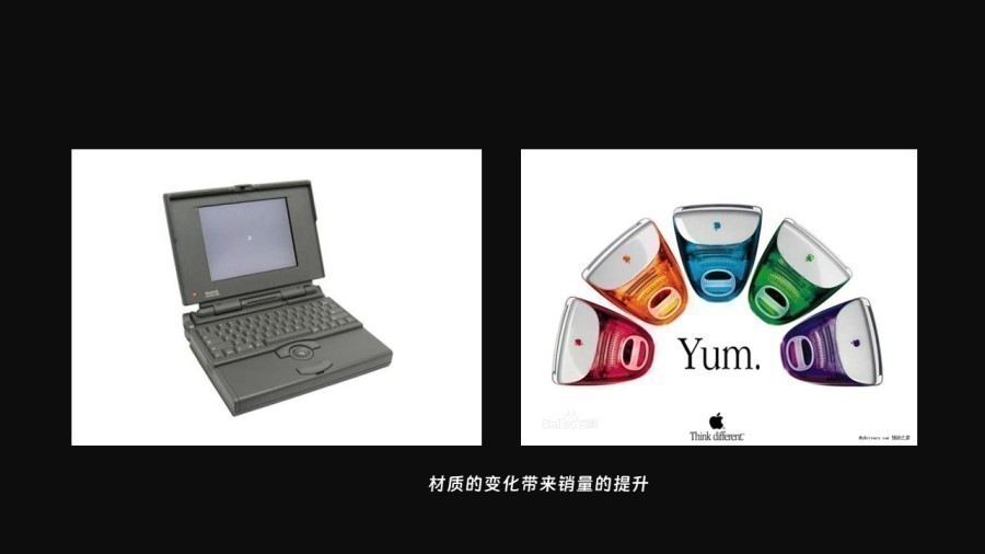 两个是苹果公司相差时间不算很长的两个产品,但右边的产品由于采用了不同的材料,更加时尚活泼,从而取得了销售的成功,也算是通过CMF设计取得商业成功的经典案例