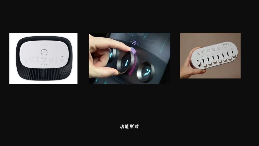 同一个部件可以有不同的功能形式,比如调大小,我可以一个按键点一次一档第二次二档第三次三档,如此循环,配三个灯点指示;我可以像中间那样无极调节;在第三个音频设备中,由于我调节的参数很多,而且我要了解每个参数当前的状态,所以它采用了多个平行的条状滑轨。不同的形式有不同的特点,好的工业设计师应该会根据实际情况选择最合理的形式。