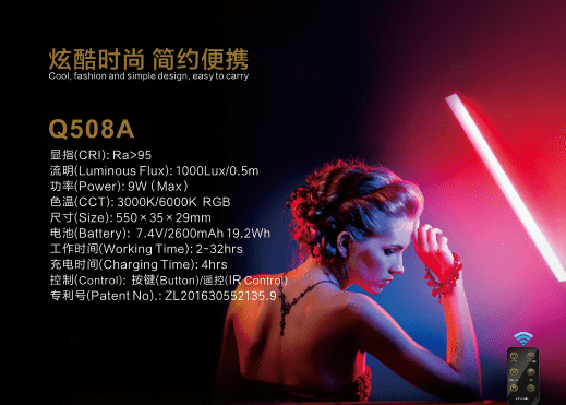 在续航方面,Q508A采用7.4V 2600mA锂电池,摄影灯LED芯片可达3W小时使用寿命,充满电最低亮度可持续使用32小时,低功耗且环保。