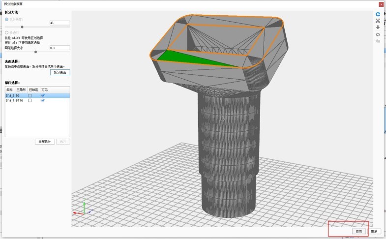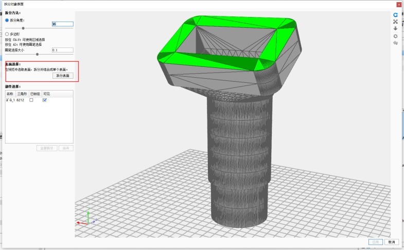 第二步 选中模型——工具——选中要做毛刷的那一面——拆分对象表面—拆分表面——应用;