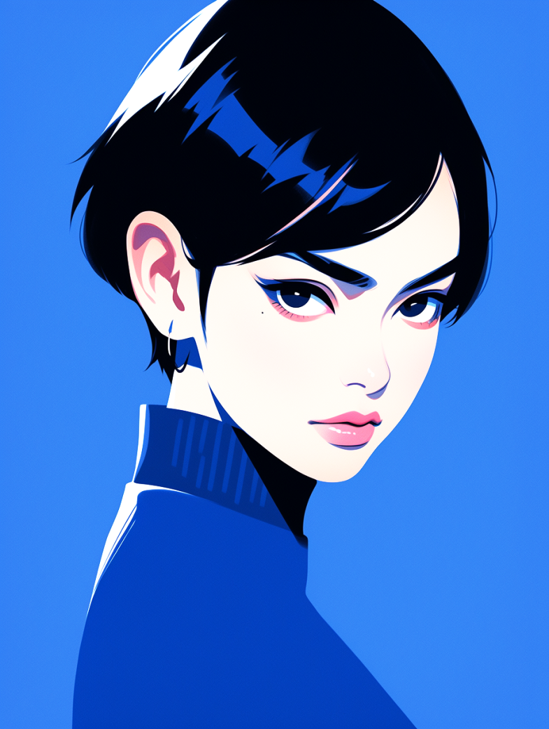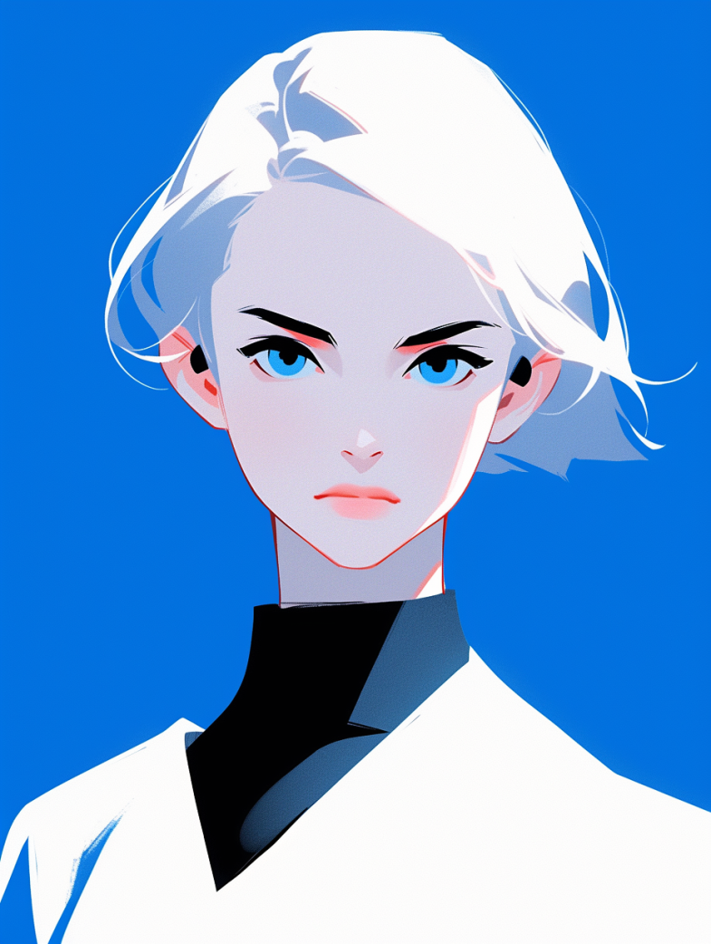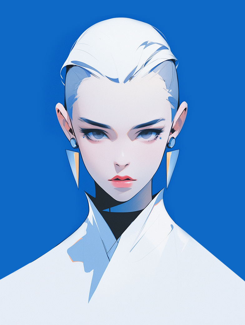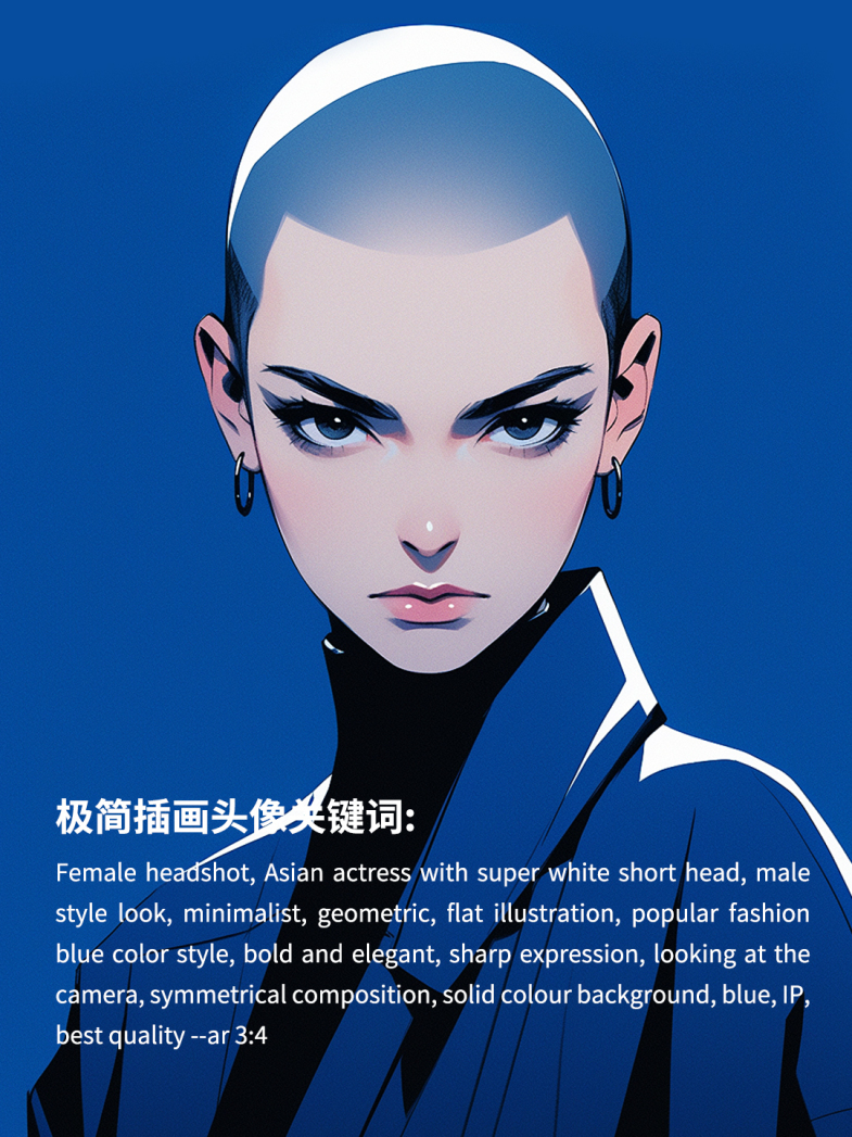 Female headshot, Asian actress with super white short head, male style look, minimalist, geometric, flat illustration, popular fashion blue color style, bold and elegant, sharp ex-pression, looking at the camera, symmetrical composition, solid colour background, blue, IP, best quality --ar 3:4