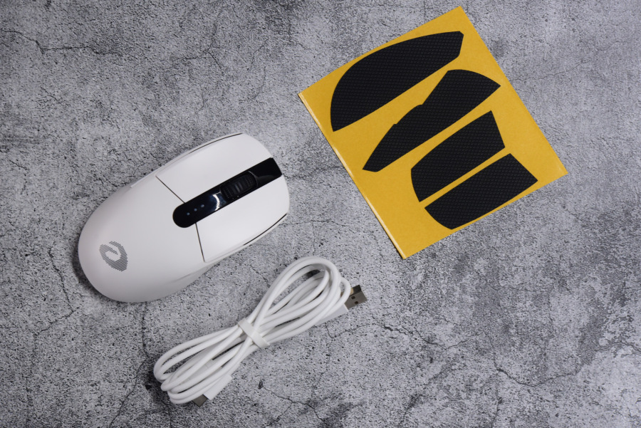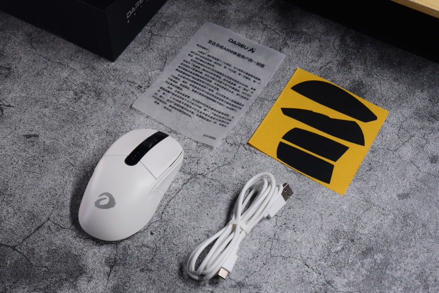 打开盒子之后感觉有点简陋,不愧是体验版本,几张非常异形的防滑贴、一张神秘的纸条、一个纯白的鼠标和一条纯白的连接线。