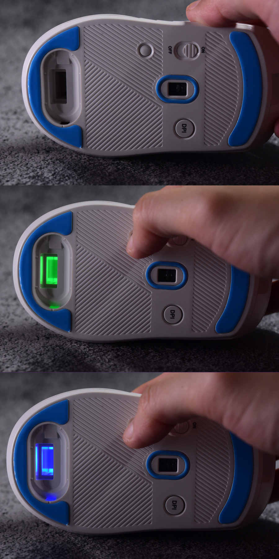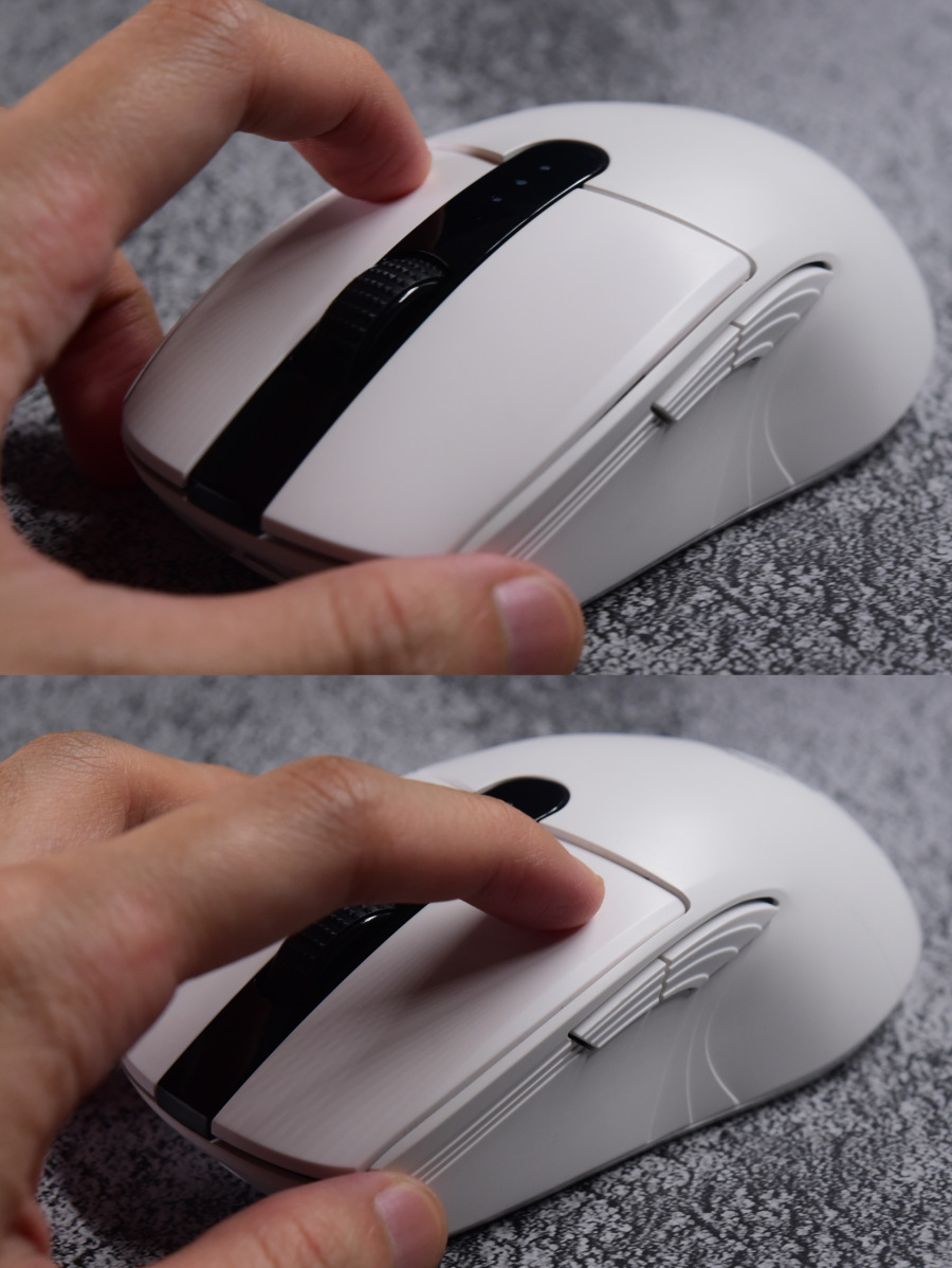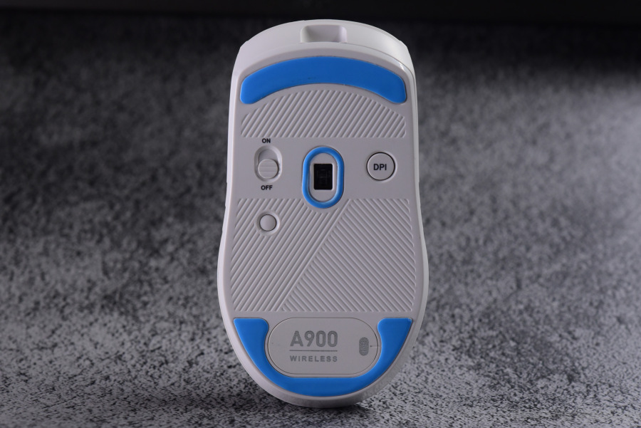 看完正面看底部,光头左上方是无线模式(蓝牙和2.4G)开关,开关下面就是蓝牙和2.4G的切换按键,按一下就切换连接模式,长按3秒就重置连接设备。而DPI键也设置在了底部光头右方,这设置怎么说了,有的人玩游戏调DPI可能不太方便,不过像我一个DPI走天下的就问题不大了。