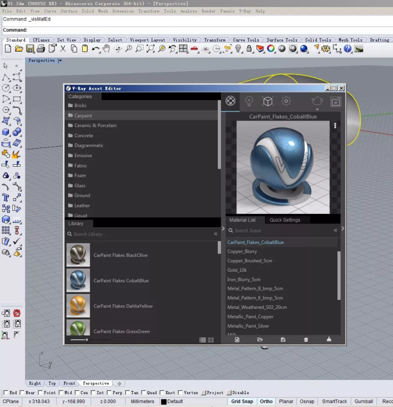 随后我们直接渲染一下,给外壳体附上Vray自带的Carpaint(汽车漆)的材质。