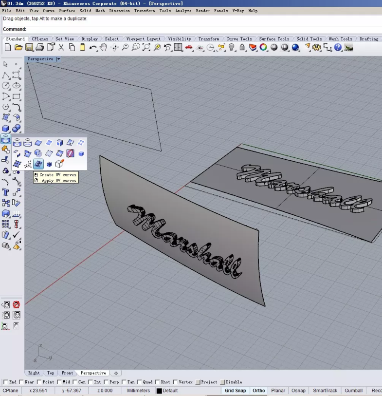 由于它是在曲面上,所以我们需要先把曲面切下一块,然后建立UV曲线,并生成平面。