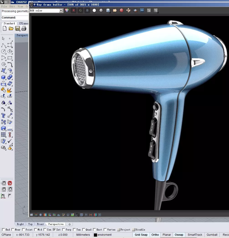 做出覆盖在吹风机把手前壳体上的一块零件。然后选取电镀的表面效果。渲染一张图。