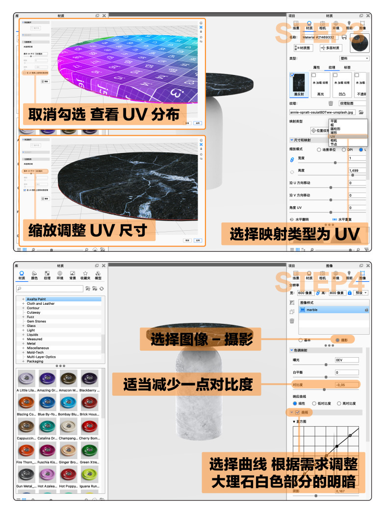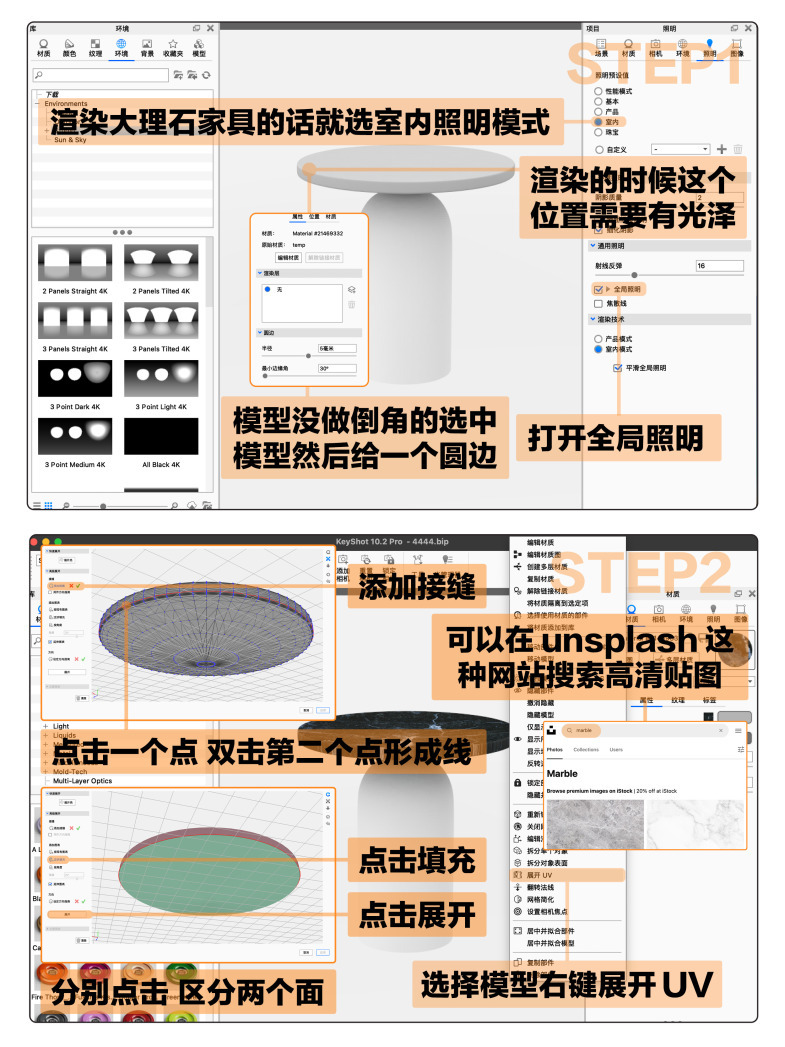 🟠 首先在keyshot里选择照明模式(产品选产品照明,演示的是桌子所以选室内照明模式)开启全局照明,产品/家具没有做倒角的点击模型,给一个圆边。(大理石两个面衔接处的高光可以增加真实感。上一个塑料材质,搜索一张高清的大理石纹理贴图(我用的是unsplash的素材)然后右键点击展开UV,点击添加接缝,这时候会出现点,选择一个点,在双击旁边的点即可形成一圈。完成之后点击绿色勾勾✅,这时候就已经形成了两个面,选择填充,分别点击两个面。然后点击展开。取消勾选就可以看到UV的分布情况,缩放尺寸调整贴图,在漫反射里选择映射类型为UV。(当然想要光滑的质感就把粗糙度改为0,想要表面粗糙/纹理,就贴一张bumpmap调整尺寸和凹凸)最后选择图像-摄影,可以适当减少一点对比度,选择曲线,根据需求调整大理石白色部分的光影和明暗即可。