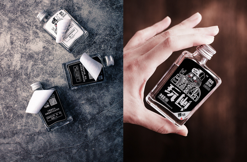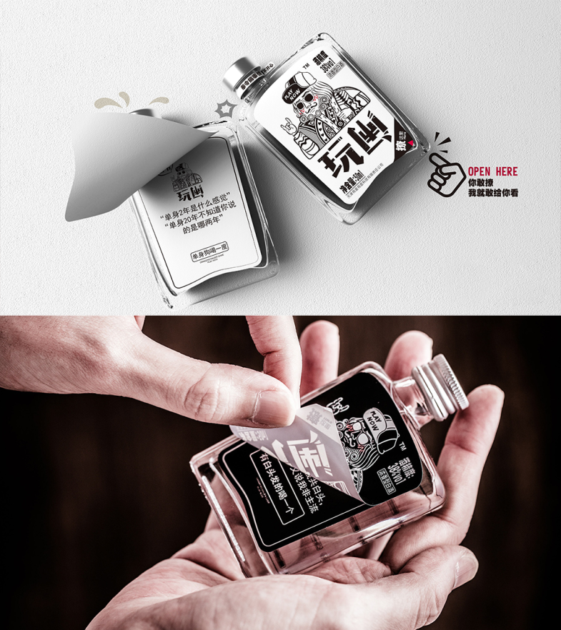 说到小白酒包装,江小白是很多人心目中的首选,走心文案引发了消费者对于青春的追忆。如果说江小白是小白酒界的文艺青年,那么这款玩闹小白酒就是社交达人,专为聚会而生。