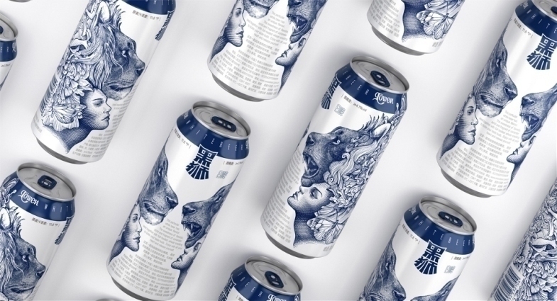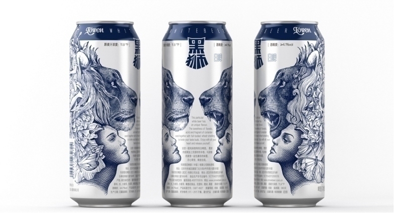 设计团队在包装插画上大胆想象:两只狮子的不同表情,传达出人们在饮酒前与饮酒后两种不同的情绪表现——克制拘束与热情奔放,它们绕过柱形罐身相互靠近,就像正在面对面交流的两个人,插画与罐身之间的适度留白,在视觉上形成了良好的缓冲。