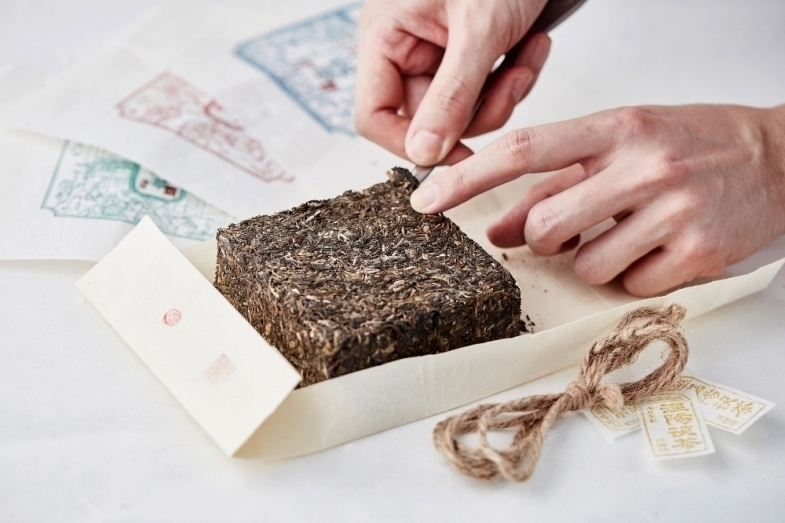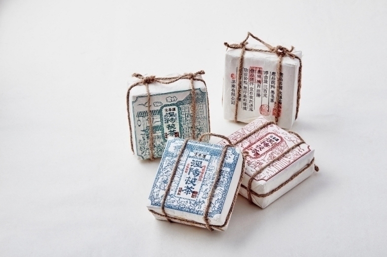 值得一提的是,当地文化不仅体现在包装内容上,表现手法上也处处透露着对传统文化的传承。包装采用白描的表现手法,用三种中式绘画古典色绿、蓝、红来承装三种不同等级的茶砖,底部采用清末流通的茶票作为贴纸封口。由天然材质制成的手工宣纸,经过人工捞纸、晒纸、裁纸等工艺,最终成型为茶砖包装用纸张,作为包装材质可有效防潮防蛀,保护茶砖。