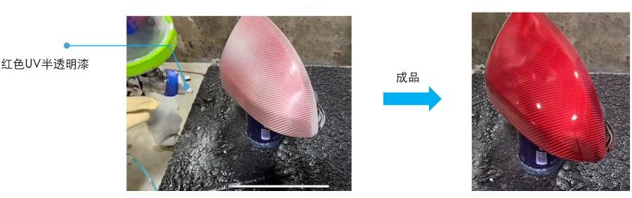 请问:“通过定制带颜色的树脂来改色”是指在预浸料阶段使用彩色树脂吗?那本身效果不也是改变整体的半透明色彩,和后期喷涂半透明UV在效果上是有什么区别吗,为什么要增加一道色彩调整工序