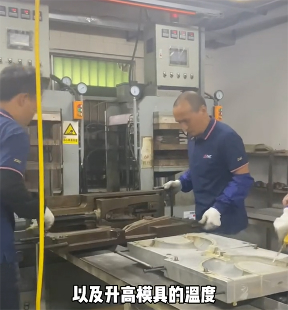 这种工艺就是我们常说的锻压工艺,有公、母模,将碳纤维布料先仔细放置到母模面并且压实好,然后模具升温升压进行锻压,一般10+分钟就可以成型一件。