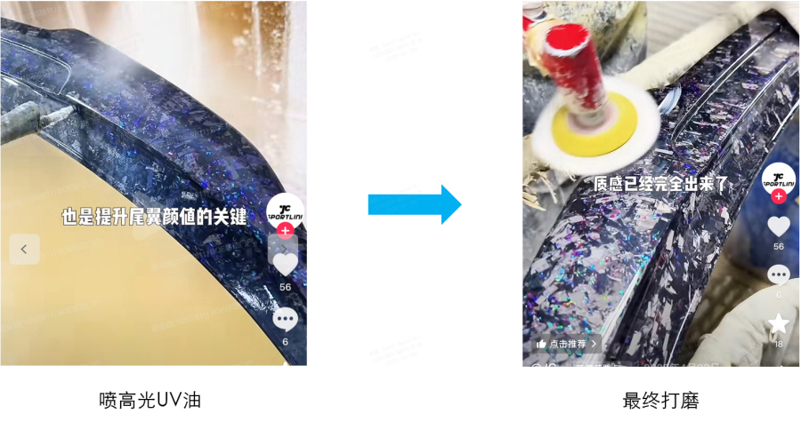 锻碳板本身是粗糙的,高亚光的处理都是在后期用UV油做的处理。 值得注意的是,高光喷油后,一般都还会再打磨一下,这样光泽度会更好。