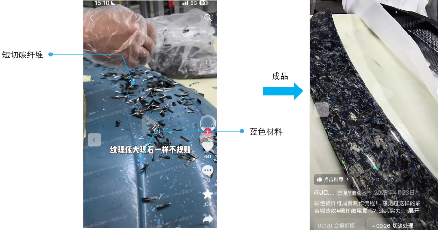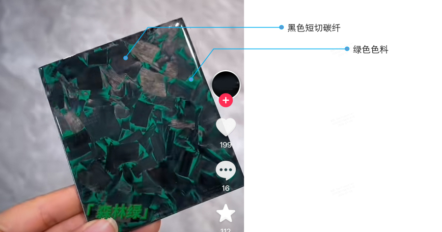 核心只有一条:如果短切锻碳的颜色是黑色,就是预浸料里添加色料;如果短切锻碳颜色变色了,就是后期上的带色UV漆。下面就是一个预浸料添色的例子,如下图: