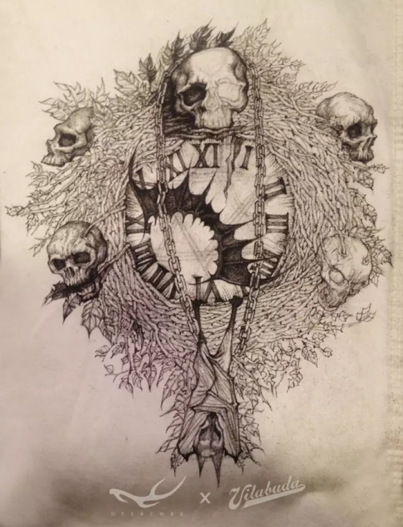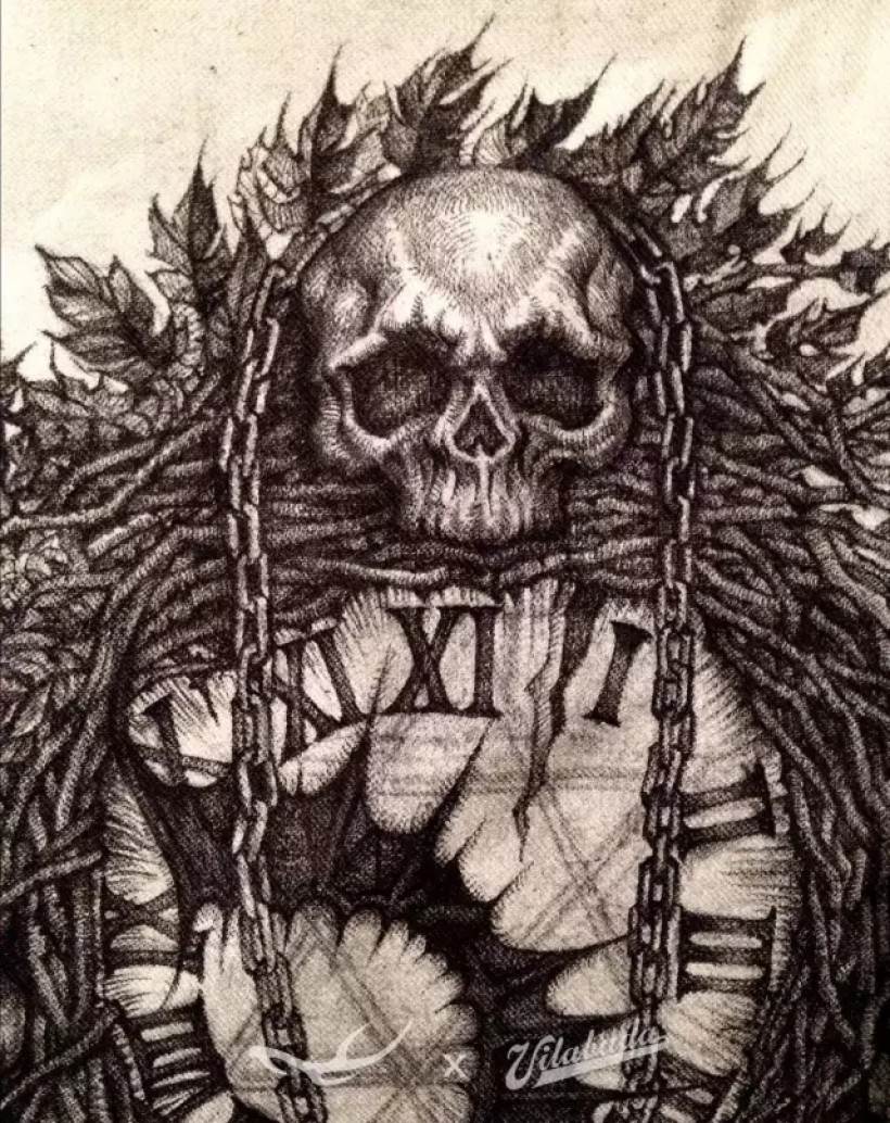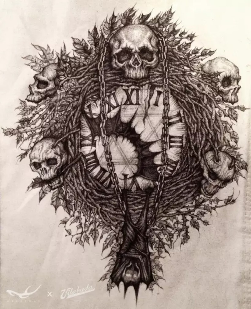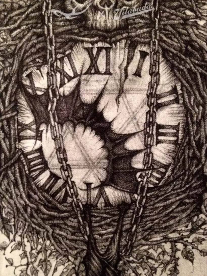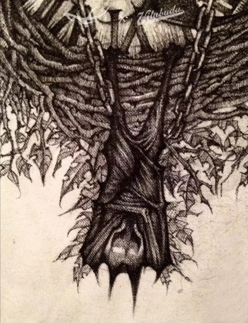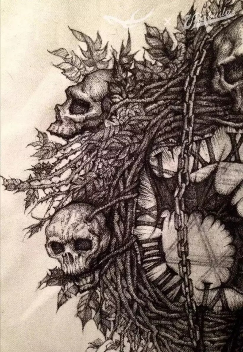 海明威有篇小说叫《丧钟为谁而鸣(For Whom The Bell Tolls)》。我喜欢的金属乐队me-tallica也创作过同名歌曲。我设计出由枯枝和骷髅构成的一只巨大丧钟,以蝙蝠的翅膀为指针,倒挂的蝙蝠为钟摆,以此同名画作向他们致敬。