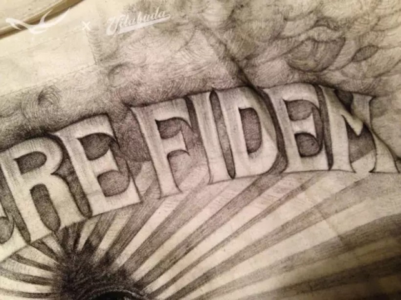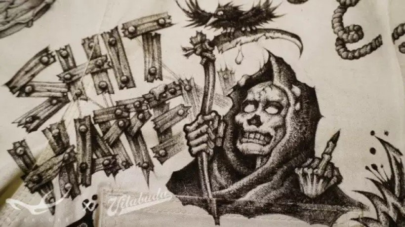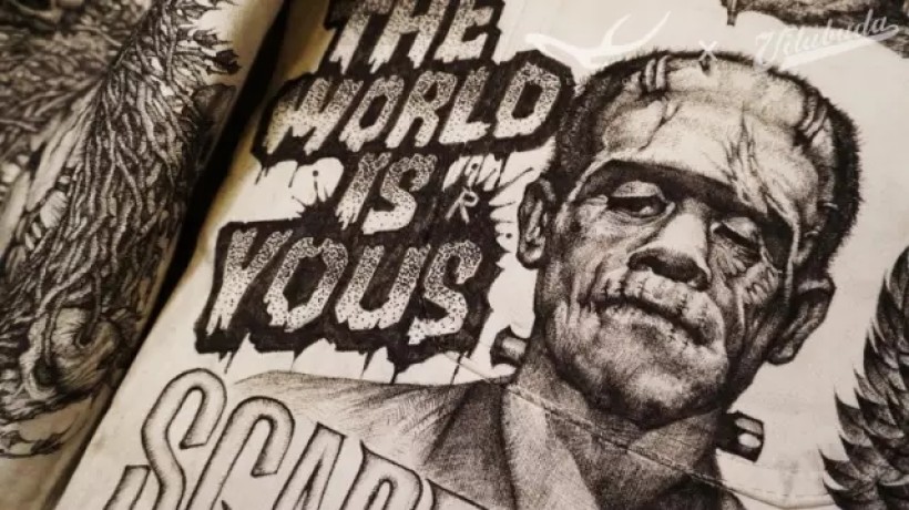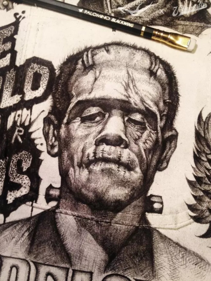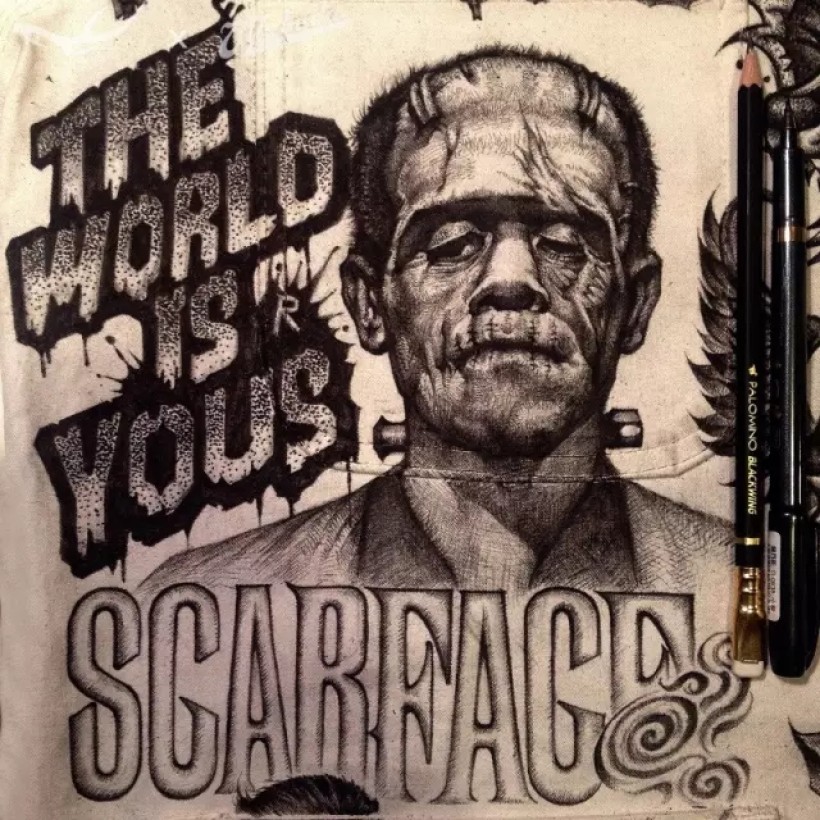 这个人物是融合了电影《科学怪人》中的角色: Frankenstein和《疤面煞星》中的角色:Tony Montana各自的特征而创造出的一个新角色。连夜绘制时脑子比较晕,出现了一个失误:漏写了字母“R”。虽然想了个笨拙的方法补救也收效甚微。以后画画要更专心才行 >_<